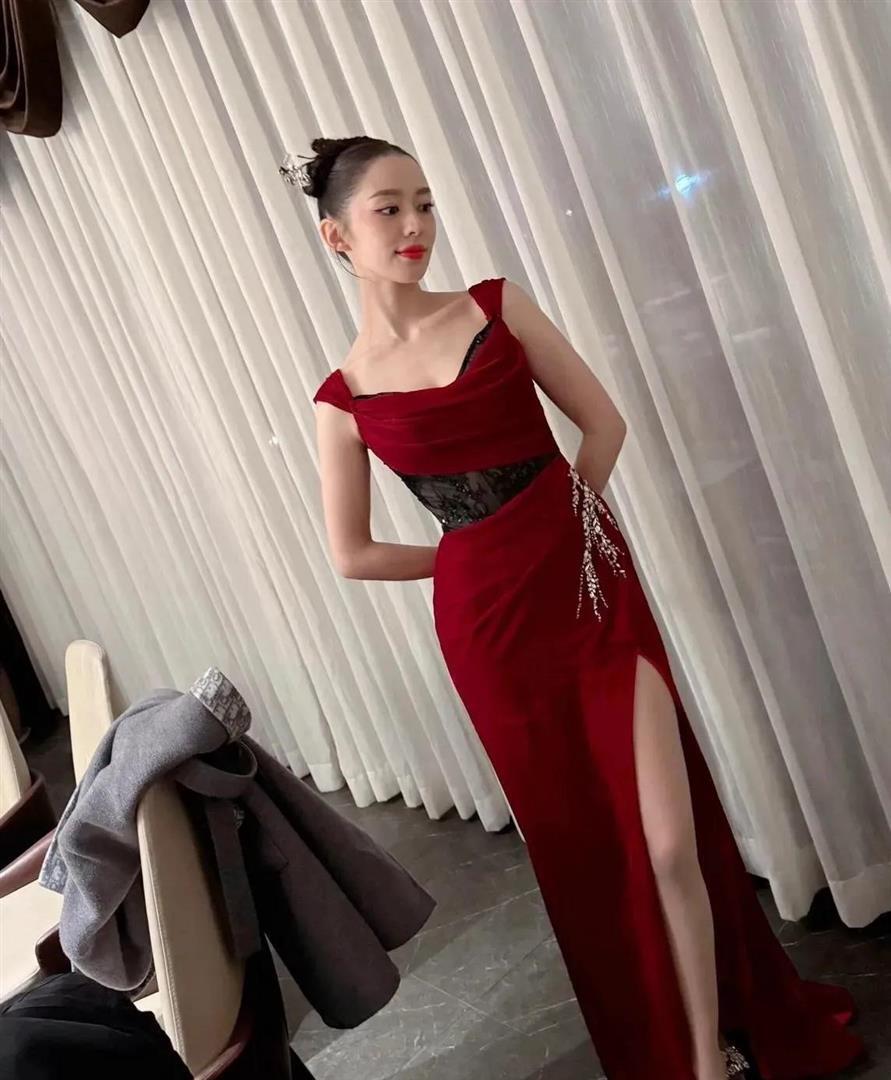 吉娜最新“红裙杀”太绝了! 盘发配开衩裙,这腰臀比是真实存在的吗?